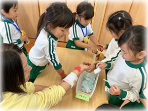 おれんじ組さんの病院ごっこ 病院ごっこをしました お医者さんや看護師さん、患者さんになりきって会話を楽しむ子どもたち 診察をしたり、怪我の手当てをしたりと、それぞれの役になりきって遊ぶ姿が見られましたよ!