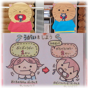 オリーブ組さんとこすもす組さんが保健指導に参加しました ホールに遊びに来たにゃんたくんと一緒に、咳やクシャミが出た時にティッシュやハンカチを使う咳エチケットのお話や、以前にも教えてもらった手洗いの歌をうたいながら、みんな […]