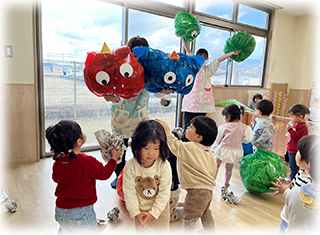 風船に鬼のイラストを貼ったりカラーポリ袋に新聞を詰めたりし鬼に見立て、「おにはそと」や「ふくはうち」と言いボールを笑顔で投げて楽しんでいたお友達😊🧡