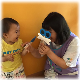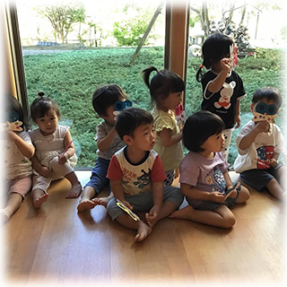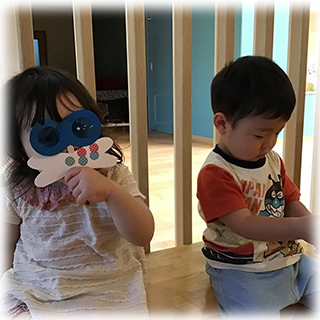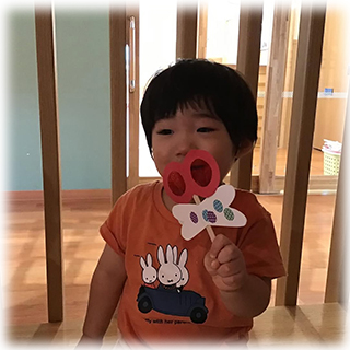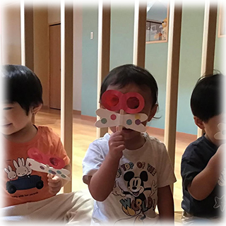 とんぼの羽にシールを貼って、かわいいとんぼのメガネを作りました 出来上がったメガネを手にしてエントランスをお散歩したり、「とんぼのメガネ」の歌を元気に歌ったりして、季節を感じながら楽しむ姿が見られましたよ!