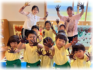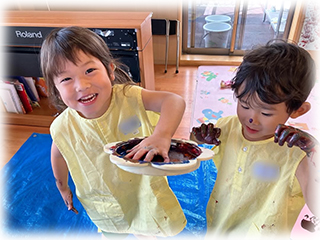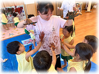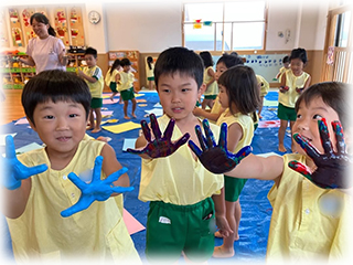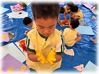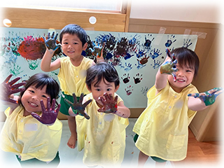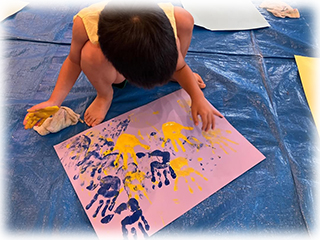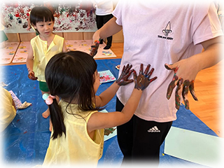 初めは恐る恐る単色で色をつけていましたが、次第に色を混ぜ合わせながら感触を楽しみ、手形を押したり夢中で取り組んでいましたよ