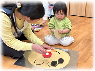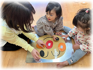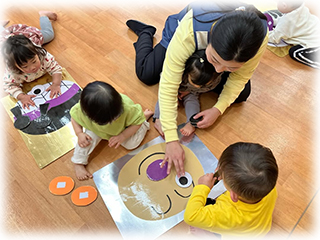 子どもたちも「どこに置こうかな?」と考えながら、目やほっぺたのパーツを台紙に置いて楽しんでいましたよ