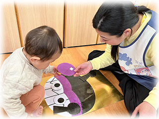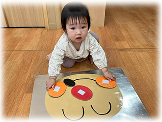 先生が目やほっぺたのパーツを置いてみると、じっと見つめ、違う場所に置くと首を振ったり指を差したりしながら「ちがう ちがう」と反応する姿が見られました