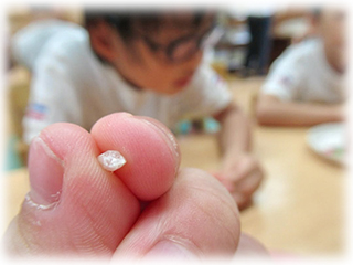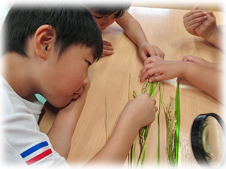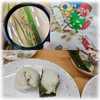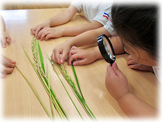 まずは稲を詳しく見るところから始まり、虫眼鏡で見たり、米粒をひとつひとつ取り出したりしてじっくりと調べることが出来ました