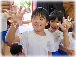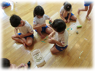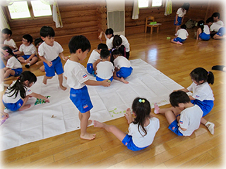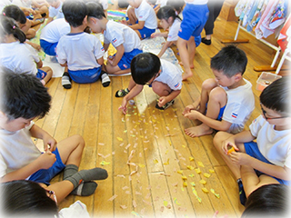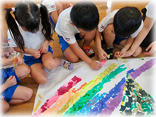 たてわりチームに分かれて、テープをたくさんちぎってペタペタと貼っていきました