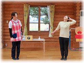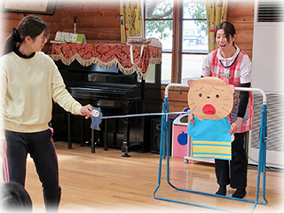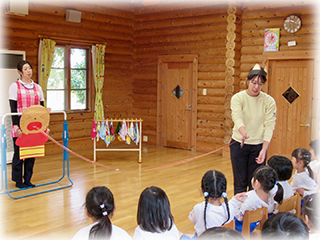 ホールに遊びに来たにゃんたくんと一緒に、咳やクシャミが出た時にティッシュやハンカチを使う咳エチケットのお話や、以前にも教えてもらった手洗いの歌をうたいながら、みんなで一緒に手洗いの練習もしました