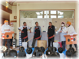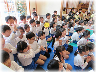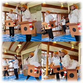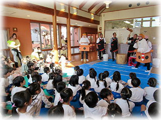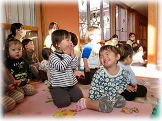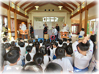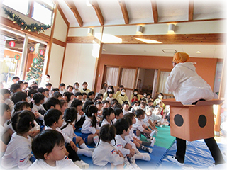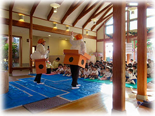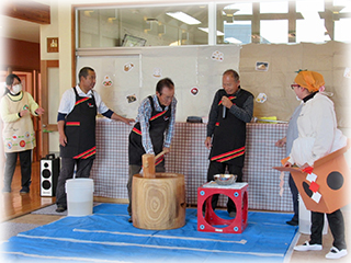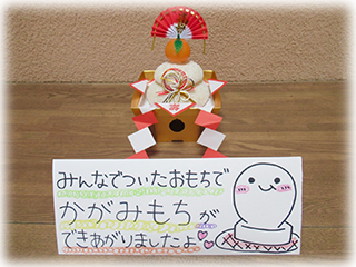 鏡もちシスターズの楽しいリズム遊びを見て楽しんだり、おもちつき名人を招待して、本物のもち米を使ってのおもちつきをしました