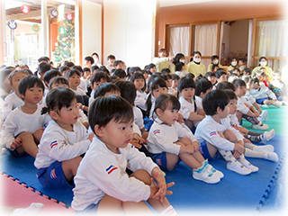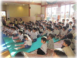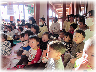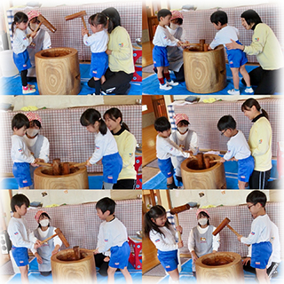 たんぽぽ組さん、こすもす組さん、オリーブ組さんのお友達は小さな杵を使っておもちつきを体験!