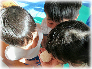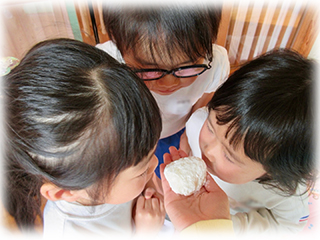 オリーブ組さんは丸めたお餅の匂いや柔らかさを確かめていました