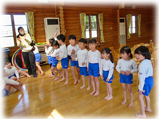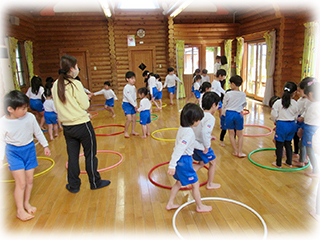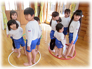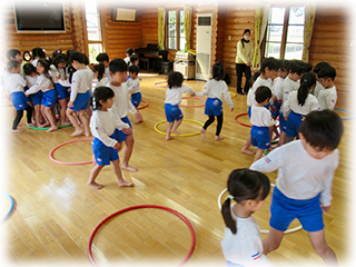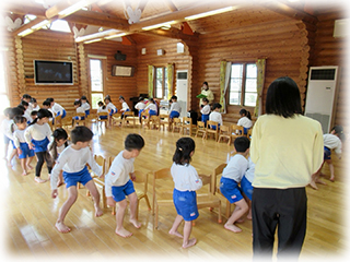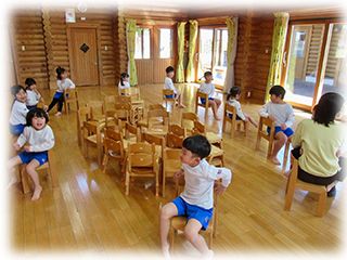 たんぽぽ組さんはゲーム遊び…椅子取りゲームやフープ鬼ごっこ